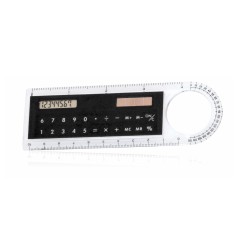Regla de 10cm con calculadora solar y lupa integradas. En original diseño bicolor en vivos colores. Sistema métrico en centímetros/pulgadas e indicador de ángulo en parte curvada. Presentada en caja individual.
