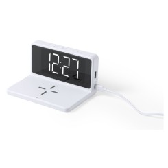 Reloj multifunción de elegante diseño en color blanco con cargador inalámbrico integrado. Con función fecha y hora, alarma y 3 posiciones de iluminación. Con puerto USB y capaz de cargar hasta dos dispositivos de manera simultánea. Cable Tipo C incluido de 100 cm y compatible con dispositivos equipados con tecnología de carga inalámbrica. Pilas de botón incluidas y presentado en atractiva caja de diseño.