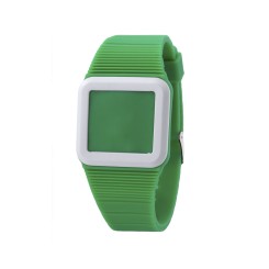 Reloj digital de pulsera con dígitos led de luz roja y activación por pulsación en pantalla. De diseño ultradelgado unibody acabado en suave y cómoda silicona. Con zona de marcaje debajo de los dígitos de la hora. Presentado en bolsa individual con refuerzo de cartón interior.