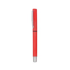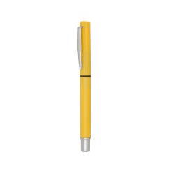Roller de capucha con cuerpo de suave acabado sólido en colores cálidos. Con accesorios en color plateado y punta de acabado transparente, clip metálico y tinta azul.
