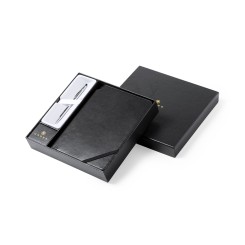 Set Century de Cross con bolígrafo y bloc de notas. Bolígrafo de mecanismo giratorio de tinta negra y cuerpo metálico de elegante terminación en plateado brillante. Bloc de notas con tapas de polipiel en acabado liso de color negro y 80 hojas con distribución a una raya. Presentado en estuche individual con logotipo de la marca.