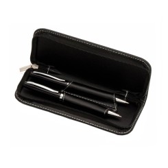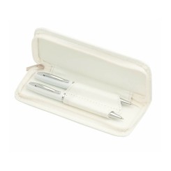 Set de bolígrafo de mecanismo giratorio y portaminas en alegre diseño bicolor. De cuerpo metálico en suave acabado de vivos colores y accesorios en colores plateados. Con cómoda empuñadura a juego y presentado en elegante estuche individual de polipiel con fundas independientes y cierre de cremallera a juego. Bolígrafo de tinta azul y portaminas con minas de 0,7mm incluidas.