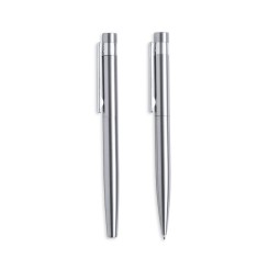 Set eco-friendly de bolígrafo y roller, fabricados en acero inox reciclado. Incluye: Bolígrafo de mecanismo giratorio, con cuerpo en acabado plateado y accesorios en cromado. Clip metálico y distintivo acero inox reciclado en la parte superior del bolígrafo. Cartucho jumbo y tinta azul.Roller con cuerpo en color plateado y accesorios en cromado. Clip metálico y distintivo acero inox reciclado en la parte superior de la capucha. Cartucho jumbo y tinta azul.Set presentado en estuche individual de diseño kraft con funda a juego.El acero es uno de los materiales más demandados y que puede encontrarse casi en todas partes, desde productos de uso diario a grandes construcciones. Con innumerables propiedades, entre las que cabe destacar la durabilidad y su alto grado de reutilización, convirtiéndolo en una alternativa muy valorada en soluciones de sostenibilidad. Debidamente tratado, permite obtener nuevos recursos de infinita utilización.