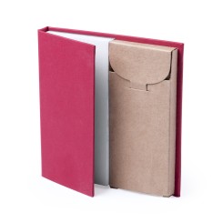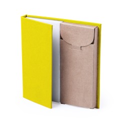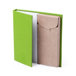 Set de bloc de notas con caja de lápices. Incluye bloc de notas de 60 hojas lisas y 6 lápices de madera en caja de cartón reciclado. Disponible en variada gama de colores.