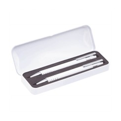 Set de bolígrafo de mecanismo pulsador y portaminas en original diseño bicolor. De cuerpo metálico en suave acabado de vivos colores y accesorios en colores plateados. Con empuñadura anillada y presentado en resistente estuche individual metálico a juego con suave espuma troquelada. Bolígrafo de cartucho jumbo con tinta azul y portaminas con minas de 0,7mm incluidas.
