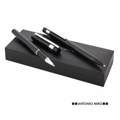 Elegante set de Antonio Miró con bolígrafo de mecanismo giratorio y roller de capucha en sobrio diseño. De cuerpo metálico en acabado negro brillante con clip plateado. Presentado en elegante estuche individual en color negro con logotipo de la marca y funda. En tinta azul.