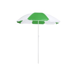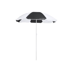 Sombrilla de playa de 8 paneles en resistente nylon de combinación bicolor. De 150cm de diámetro, con faldones laterales ribeteados, tubos metalizados en color blanco y ajustable en altura. Presentada en funda de PVC con cinta de transporte para hombro. Disponible en variada gama de colores combinados.