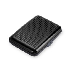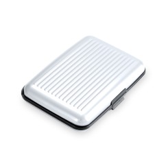 Elegante tarjetero con cuerpo en acabado de aluminio y elegantes colores. Con 6 compartimentos interiores de disposición en acordeón, sistema de cierre clic y zona lisa en el exterior diseñada para marcaje en láser. Presentado en caja individual plateada.