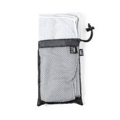Toalla absorbente de línea nature. Fabricada en RPET de 160g/m2, elaborado a partir de plástico reciclado para así fomentar la reutilización de residuos plásticos y contribuir a la sostenibilidad del planeta. Tamaño 50x100 cm, presentada en funda individual de redecilla RPET con parte trasera lisa y disponible en variada gama de colores. Con distintivo RPET en etiqueta.