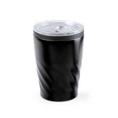 Vaso fabricado en acero inox de 350ml de capacidad. Cuerpo con diseño biselado, con anilla de color negro. Con original tapón dosificador transparente y abrefácil. Es ideal para tener en tu escritorio, mesa o en cualquier superficie donde disfrutar tranquilamente de tu bebida favorita.
